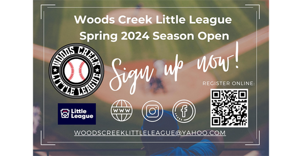 • Registration for the 2026 Woods Creek Little League Season opens November 1st and will run to January 8th!